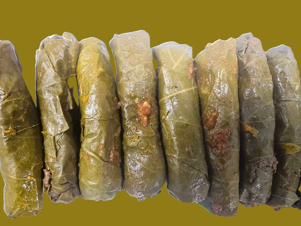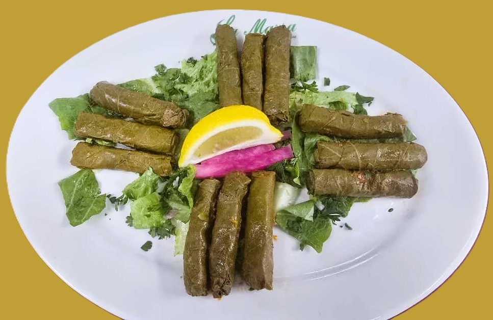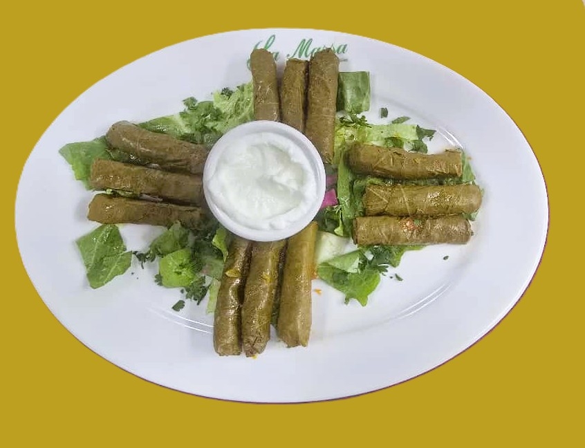 New - Thinner Tastier Grape Leaves stuffed with ground meat, rice, parsley, green onions and Mediterranean seasonings and Served with yogurt (12 Pieces).